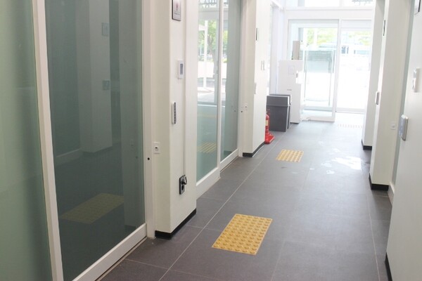 1층 주출입문은 터치식자동문 1곳으로 앞바닥에 점자블록이 설치돼 있어 휠체어를 사용하는 장애인이 불편을 겪을 것으로 보였다. 터치식자동문이나 자동문 2곳을 설치하고, 한곳의 앞바닥에 점자블록을 설치하면 모두 불편 없이 이용할 수 있다.