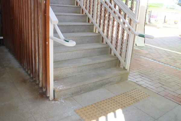 계단은 외부에 설치됐는데, 양쪽에 시각장애인이 손끝으로 만져 층수를 알 수 있는 점자표지판이 부착된 손잡이, 계단 입구 바닥에 점자블록이 양호하게 설치됐다.