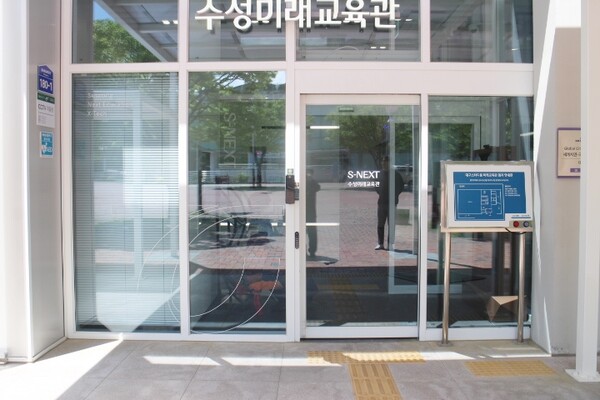 수성미래교육관 1층 주출입문은 터치식자동문 1곳으로 앞바닥에 점자블록이 설치돼 있어 휠체어를 사용하는 장애인이 불편을 겪을 것으로 보였다. 터치식자동문이나 자동문 2곳을 설치하고, 한곳의 앞바닥에 점자블록을 설치하면 모두 불편 없이 이용할 수 있다. ©박종태