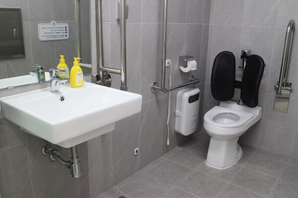 남녀장애인화장실은 1층 남녀비장애인화장실 입구에 설치돼 있어 성별이 다른 활동보조인의 도움을 받을 수 있다. 출입문도 손이 불편하거나 휠체어를 사용하는 장애인이 이용하기 편한 터치식자동문이다.